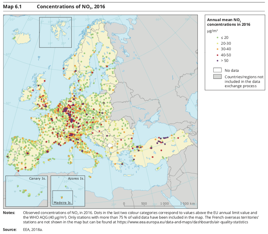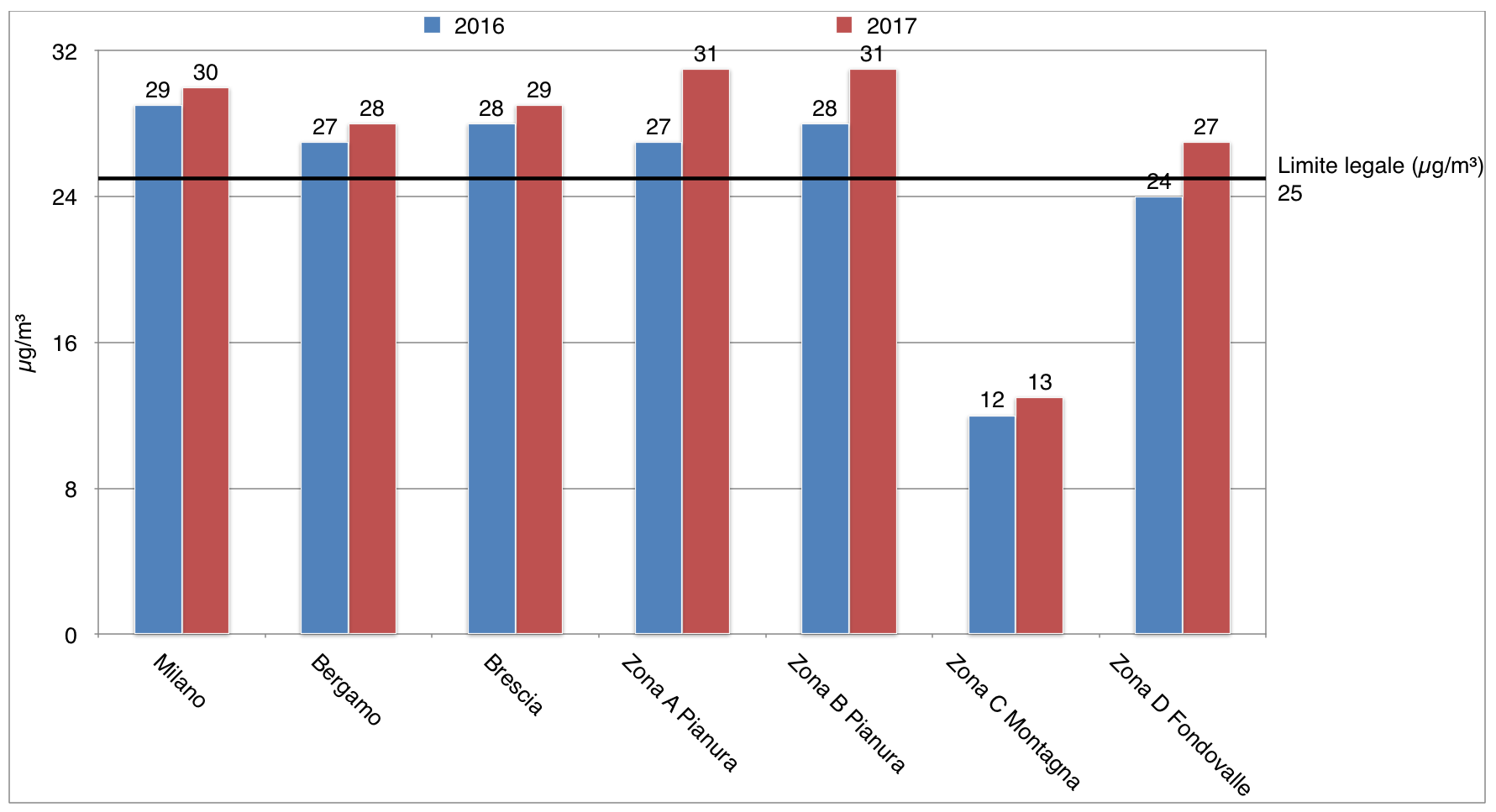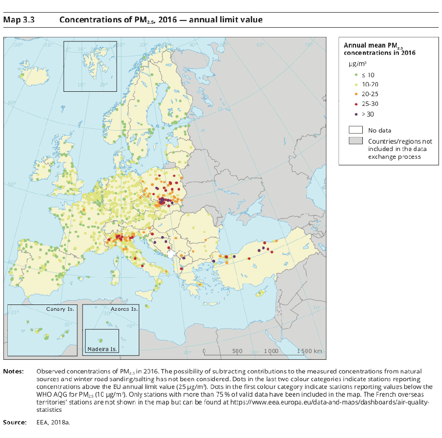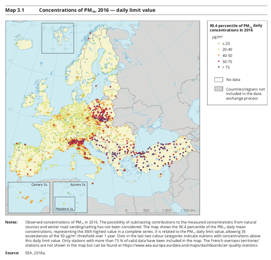 La Lombardia è, ad oggi, una delle regioni più inquinate d’Europa, come mostrano le tre mappe qui sotto tratte dal rapporto EEA Air quality in Europe – 2018. I livelli di particolato (PM10 e PM2.5) e di biossido di azoto (NO₂) sono al di sopra dei limiti di legge [EEA Air quality in Europe – 2018 report – pagg. 28 e 46].