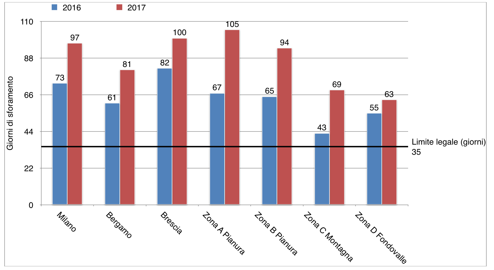 Non solo. I dati 2017 rivelano che le concentrazioni di PM10 e PM2.5 sono nettamente cresciute su tutto il territorio regionale in confronto all’anno precedente. Il numero dei giorni di sforamento per il PM10, per esempio, è aumentato a Milano di 24 giorni (da 73 a 97), a Bergamo di 20 giorni (da 61 a 81) e a Brescia di 18 giorni (da 82 a 100). Inoltre, l’Italia è tra tutti gli stati UE quello con il numero più alto di morti premature dovute al biossido d’azoto e il secondo per quanto riguarda gli impatti del particolato fine [EEA Air quality in Europe – 2018 report – pag.64].